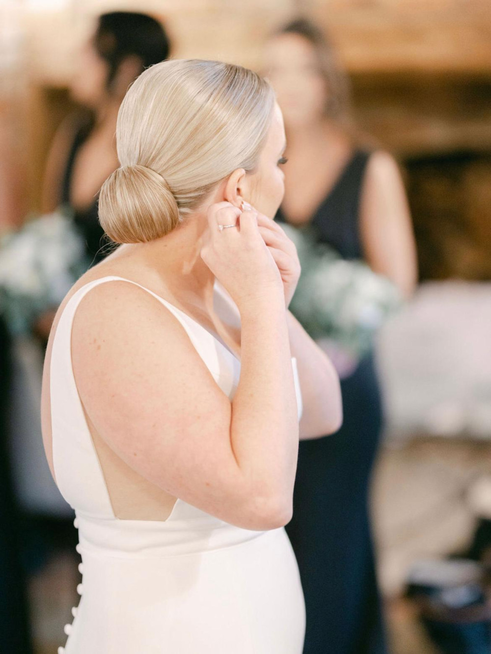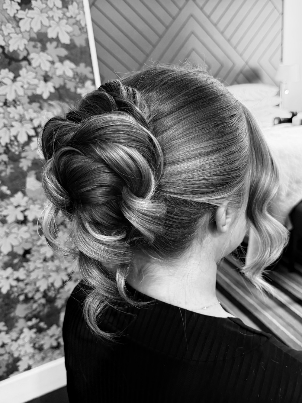Photography by: By Rebecca Eve. #blonde #bridesmaidhair #bridalhairstylist #blackandwhite #texturedupdo #bridalbun